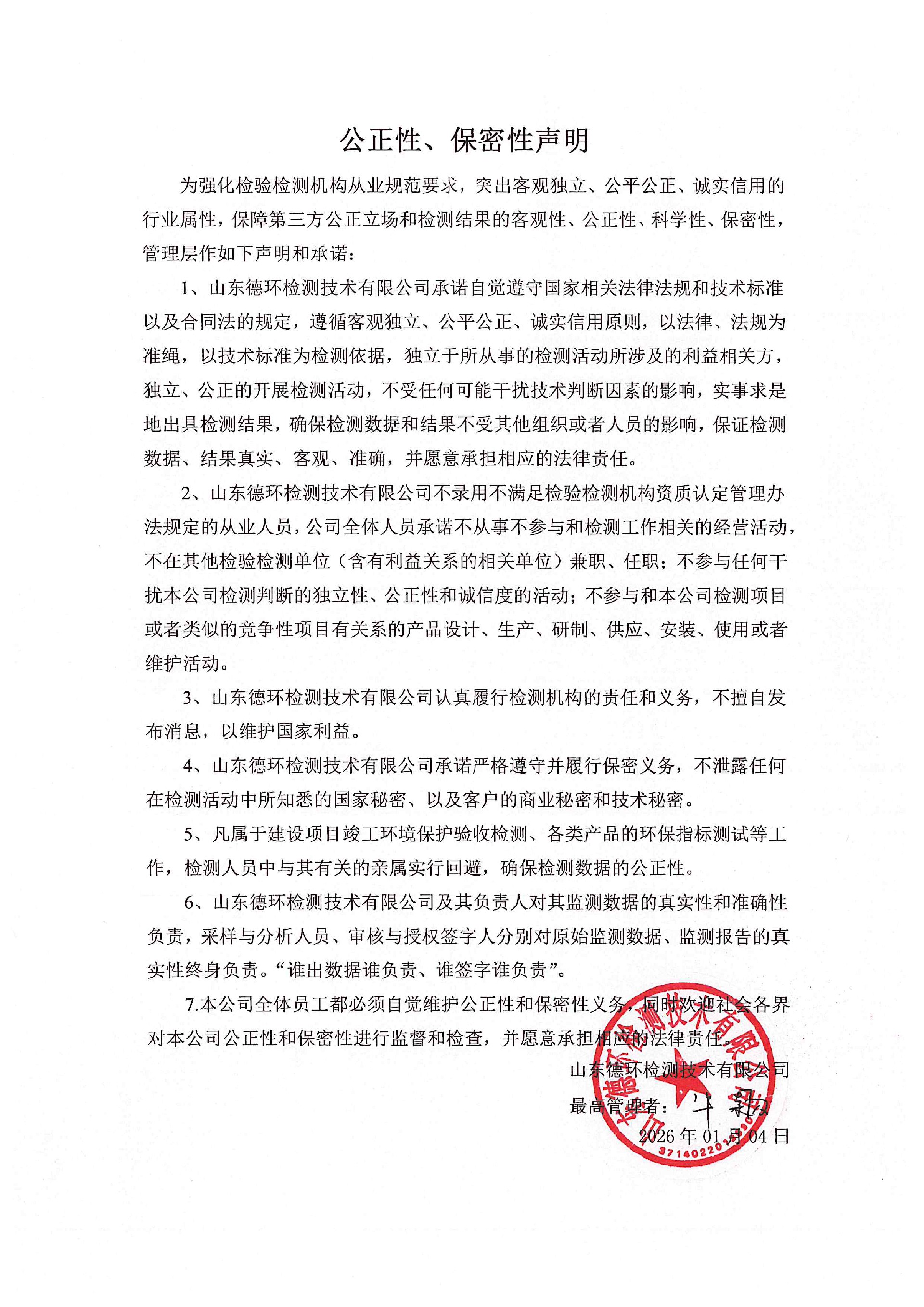 為強(qiáng)化檢驗(yàn)檢測機(jī)構(gòu)從業(yè)規(guī)范要求,突出客觀獨(dú)立、公平公正、誠實(shí)信用的行業(yè)屬性,保障第三方公正立場和檢測結(jié)果的客觀性、公正性、科學(xué)性、保密性,管理層作如下聲明和承諾: 1、山東德環(huán)檢測技術(shù)有限公司承諾自覺遵守國家相關(guān)法律法規(guī)和技術(shù)標(biāo)準(zhǔn)以及合同法的規(guī)定,遵循客觀獨(dú)立、公平公正、誠實(shí)信用原則,以法律、法規(guī)為準(zhǔn)繩,以技術(shù)標(biāo)準(zhǔn)為檢測依據(jù),獨(dú)立于所從事的檢測活動(dòng)所涉及的利益相關(guān)方,獨(dú)立、公正的開展檢測活動(dòng),不受任何可能干擾技術(shù)判斷因素的影響,實(shí)事求是地出具檢測結(jié)果,確保檢測數(shù)據(jù)和結(jié)果不受其他組織或者人員的影響,保證檢測數(shù)據(jù)、結(jié)果真實(shí)、客觀、準(zhǔn)確,并愿意承擔(dān)相應(yīng)的法律責(zé)任。 2、山東德環(huán)檢測技術(shù)有限公司不錄用不滿足檢驗(yàn)檢測機(jī)構(gòu)資質(zhì)認(rèn)定管理辦法規(guī)定的從業(yè)人員,公司全體人員承諾不從事不參與和檢測工作相關(guān)的經(jīng)營活動(dòng),不在其他檢驗(yàn)檢測單位(含有利益關(guān)系的相關(guān)單位)兼職、任職;不參與任何干擾本公司檢測判斷的獨(dú)立性、公正性和誠信度的活動(dòng);不參與和本公司檢測項(xiàng)目或者類似的競爭性項(xiàng)目有關(guān)系的產(chǎn)品設(shè)計(jì)、生產(chǎn)、研制、供應(yīng)、安裝、使用或者維護(hù)活動(dòng)。 3、山東德環(huán)檢測技術(shù)有限公司認(rèn)真履行檢測機(jī)構(gòu)的責(zé)任和義務(wù),不擅自發(fā)布消息,以維護(hù)國家利益。 4、山東德環(huán)檢測技術(shù)有限公司承諾嚴(yán)格遵守并履行保密義務(wù),不泄露任何在檢測活動(dòng)中所知悉的國家秘密、以及客戶的商業(yè)秘密和技術(shù)秘密。 5、凡屬于建設(shè)項(xiàng)目竣工環(huán)境保護(hù)驗(yàn)收檢測、各類產(chǎn)品的環(huán)保指標(biāo)測試等工作,檢測人員中與其有關(guān)的親屬實(shí)行回避,確保檢測數(shù)據(jù)的公正性。 6、山東德環(huán)檢測技術(shù)有限公司及其負(fù)責(zé)人對(duì)其監(jiān)測數(shù)據(jù)的真實(shí)性和準(zhǔn)確性負(fù)責(zé),采樣與分析人員、審核與授權(quán)簽字人分別對(duì)原始監(jiān)測數(shù)據(jù)、監(jiān)測報(bào)告的真實(shí)性終身負(fù)責(zé)?!罢l出數(shù)據(jù)誰負(fù)責(zé)、誰簽字誰負(fù)責(zé)”。 7.本公司全體員工都必須自覺維護(hù)公正性和保密性義務(wù),同時(shí)歡迎社會(huì)各界對(duì)本公司公正性和保密性進(jìn)行監(jiān)督和檢查,并愿意承擔(dān)相應(yīng)的法律責(zé)任。 山東德環(huán)檢測技術(shù)有限公司 2026年01月04日 微信圖片_20260104090332.jpg
